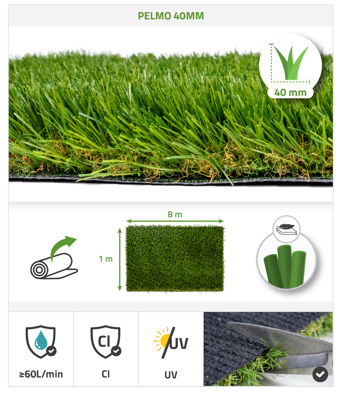 PELMO synthetic grass 1m x 8m - 40mm